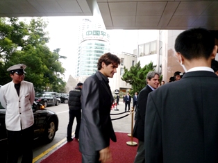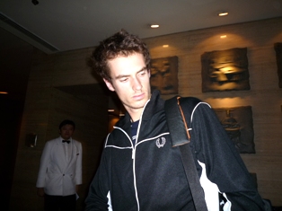 前日食事から戻ってきたのが1時近くで、寝たのが3時なのでゆっくり寝ようと思っていたのに、7時頃から隣の部屋(の廊下)がうるさくて起こされる。「うるさーい」と叫びたかった・・・。日本人の男性っぽいかったし。 結局9時過ぎには朝食に。 この日はダブルスの試合が14時〜で、シングルスは18時〜。 ダブルスはそれほど見なくても・・・なので、16時過ぎ頃会場に着くように行けばいいということで、その後買い物に。 ホテルから歩いて5分ほどのところにそごう系のデパートがあるのでそこへ。日本のデパートと同じで1階が化粧品、その上が洋服関係、地下が食品売り場。 化粧品や洋服は日本でもおなじみのブランドも多く、値段もおなじみの値段(苦笑) 中国の物価で考えるとかなり高い。フツーにブーツが3万とかでしたし。デパ地下はかなり広く、どちらかというとスーパーに近い感じ。お土産用のお茶をメインに買い物。 大会のスポンサーであるハイネケンのビールの大会限定版を売っていて激しく欲しかったんだけど、350ml缶×12本+記念缶(500ml)ってのはさすがに無理でした(汗) いったんホテルに戻って、再度買い物に。土曜日にも行っていたホテルオークラ内になる三越へ。 三越といっても、大き目のホテル内ショップという程度でしたが、さすがにデパートなので品質が良かったです。シノワテイストのグッズが欲しかったので、いくつか購入。 1番欲しいと思ったバックは3万くらいしたのでやめました(苦笑) オークラにはタクシーで行きましたが、初乗りの11元で行けるので楽でした。(1元@15円。11元=165円!) ホテルに戻って、お昼を食べるために中華レストランへ。 それほどお腹すいてなかったので、かにの卵入りチャーハンとマンゴープリンを食べました。 チャーハンがとにかく美味しくて、旅行中のNo.1料理でしたね(笑) ホテルのレストランのわりにかなりリーズナブルで(量は少なかったけど)チャーハンとプリンで1500円くらい。 レストランが2階だったので、そのままロビーに下りようと中央階段付近に行ったら眼下にデルポトロ発見! スタッフとしゃべってはいたけど、他に人もほとんどいなくて、近くに行ってサインとかもらうスタンバイ。待ってる間に数人の日本人の人が来て一緒に待つ。結構待ったけど、歩き出そうとするデルポを捕まえて写真を撮ってもらう。 驚きの身長差(50cm)でしたが、向こうから寄り添ってくれてイイ感じ。内心、デルポってイイ子〜と思いました。彼は私より一回りもしたですから・・・。 しばらく待ってると、今度はジョコビッチ登場。 彼は若い子に人気があって、すでに数人に囲まれてましたので、私もその輪に加わってサインをもらう。写真も撮ってもらったんだけど、他の人と一緒になってしまい3shotだったのと、ジョコも私もカメラ見てなかったので失敗写真(汗) デルポとジョコの時に一緒だった日本人の人たちが会場に向かうということで分かれてしばらくして、本日試合のあるマレー登場。 写真を撮ってもらいたかったけど、周りに誰もいない!! 仕方なく目の前にいたホテルのマネージャーっぽい人に頼んで撮ってもらう。会場に向かうので歩き出したマレーを追ってサインももらったんだけど、もらった場所は回転扉の中。 ああ、FANの人ゴメンね。さすがに同じ回転扉に入ってしまうとは思ってませんでいた(汗) ヒルトンの回転扉、大きくて5人以上入れる扉なので、まぁいいか。 その後、私もタクシーで会場へ。 ホテルから乗ったのでベルの人が運転手に行き先を行ってくれるんだけど、運転手はいまいちわかっていなかったみたいで、私の持っていたチケットホルダー(に書いてある地図)を見せてくれと要求。とりあえず渡すと、その地図とにらめっこした後、返してくれず助手席へ。 そのホルダーの中に今日のチケット入ってるんだから万一なくなると困るんですけど!! と途中で昨日の分のホルダー(もちろんチケットは抜いて)と交換してもらう。 結局その地図と10回くらいにらめっこしつつ走る運転手。 昨日と同じ風景になってきたので、途中からは大丈夫かな?と思ったけど、前半はかなり不安でした。そんな中、ロディックの乗ったオフィシャルカーを追い越す。並走でもいいんですけど〜と思ったけど、一瞬で追い越したよ・・・。 この日は試合が終わったのが10時20分くらい。 前日隣の席だった人たちは3列ほど斜め後ろと近かったのでまた一緒に帰ることに。会場内には7割以上の人が残っていて、その人たちが一斉に帰るから、タクシー待ちの列が大変なことに。 周りはホントに何もなくて、電車の駅も車で15分の距離なので、タクシーを待つしかない。係員が誘導するも、中国人同士で喧嘩も。怖かったです・・・。 なんとか40分ほどでタクシーに乗れて、ホテルに着いたのが12時過ぎ。 遅いのでホテルのラウンジでコーヒーを飲みながらラファ談義に花が咲く(笑) 一緒だった人の一人が去年、このヒルトンでラファに会ったという羨ましい話