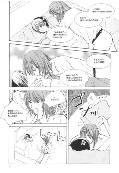 このマンガのネームを切ったのが2003年の6月くらい。 最初から永夏とヒカルの関係は決めていた(ヒカルにとって初めて関係を持つのがアキラ、というのがイヤだった)ので、先行してマンガで永夏×ヒカルのシーンを書いたのですが、実際の連載している本編でこの二人のエピが出てくるのは、本を制作した時から、実に1年以上後(2004年の秋頃にact.09スタート)になってしまったのでした…(笑) だから、innocentのうんと初期の頃にこの本をお持ちの方は、永夏と秀英の登場をずーっとお待ち頂くことになってしまったのでした。すみません…… |