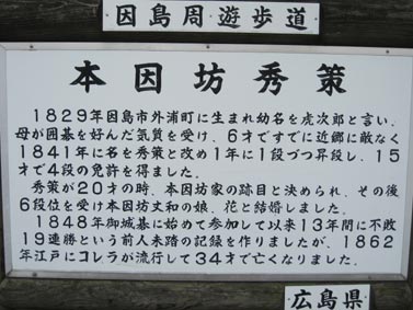 石切神社入り口にある看板。 秀策の簡単な年表です。 |